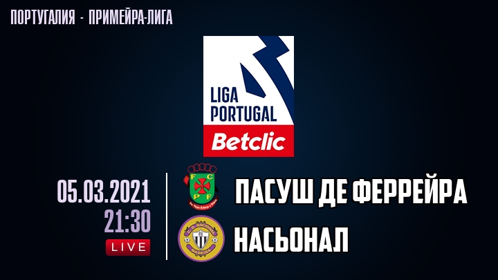 5 марта 2021 года, мы предлагаем посмотреть онлайн трансляцию футбольного матча между футбольным клубом Пасуш де Феррейра и футбольным клубом Насьонал, проходящего в рамках Примейра-лиги Португалии.