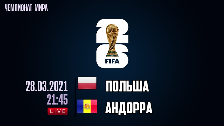 28 марта 2021 года, мы предлагаем посмотреть онлайн трансляцию футбольного матча между сборной Польши и сборной Андорры, проходящего в рамках Чемпионата мира по футболу.