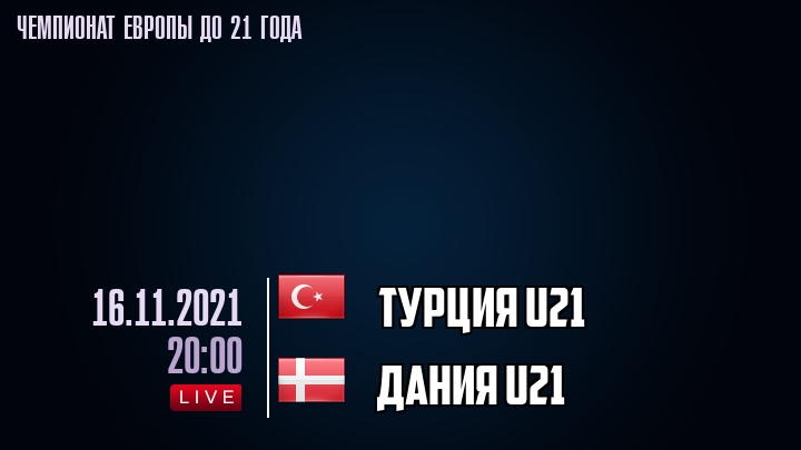 16 ноября 2021 года, мы предлагаем посмотреть онлайн трансляцию футбольного матча между сборной Турции и сборной Дании, проходящего в рамках Чемпионата Европы до 21 года.
