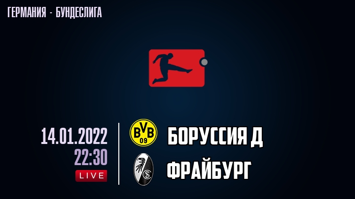 14 января 2022 года, мы предлагаем посмотреть онлайн трансляцию футбольного матча между футбольным клубом Боруссия Д и футбольным клубом Фрайбург, проходящего в рамках Бундеслиги Германии.