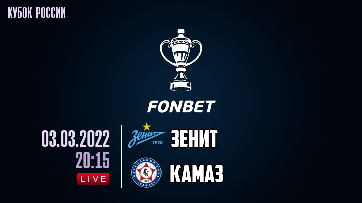 3 марта 2022 года, состоялась онлайн трансляция футбольного матча между футбольным клубом Зенит и футбольным клубом КАМАЗ, проходящего в рамках Кубка России.
