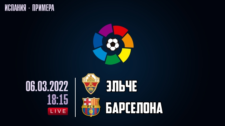 6 марта 2022 года, состоялась онлайн трансляция футбольного матча между футбольным клубом Эльче и футбольным клубом Барселона, проходящего в рамках чемпионата Испании.