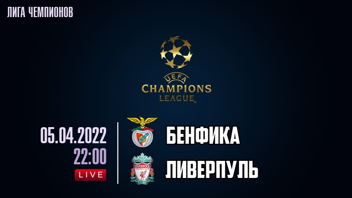 5 апреля 2022 года, мы предлагаем посмотреть онлайн трансляцию футбольного матча между футбольным клубом Бенфика и футбольным клубом Ливерпуль, проходящего в рамках Лиги Чемпионов.
