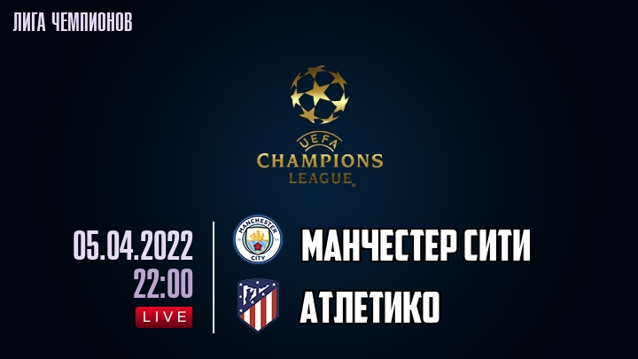 5 апреля 2022 года, мы предлагаем посмотреть онлайн трансляцию футбольного матча между футбольным клубом Манчестер Сити и футбольным клубом Атлетико, проходящего в рамках Лиги Чемпионов.