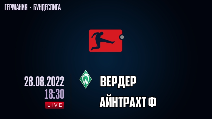 28 августа 2022 года, состоялась онлайн трансляция футбольного матча между футбольным клубом Вердер и футбольным клубом Айнтрахт Ф, проходящего в рамках Бундеслиги Германии.