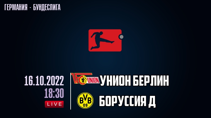 16 октября 2022 года, состоялась онлайн трансляция футбольного матча между футбольным клубом Унион Берлин и футбольным клубом Боруссия Д, проходящего в рамках Бундеслиги Германии.
