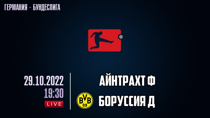 29 октября 2022 года, состоялась онлайн трансляция футбольного матча между футбольным клубом Айнтрахт Ф и футбольным клубом Боруссия Д, проходящего в рамках Бундеслиги Германии.