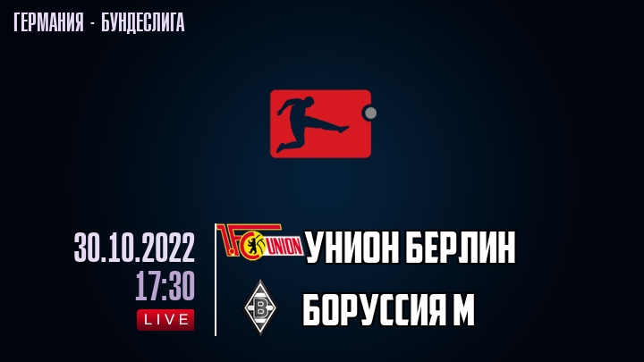 30 октября 2022 года, состоялась онлайн трансляция футбольного матча между футбольным клубом Унион Берлин и футбольным клубом Боруссия М, проходящего в рамках Бундеслиги Германии.