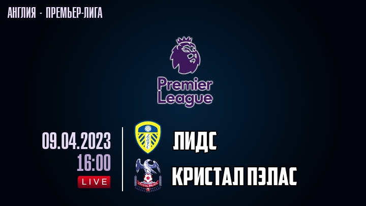9 апреля 2023 года, состоялась онлайн трансляция футбольного матча между футбольным клубом Лидс и футбольным клубом Кристал Пэлас, проходящего в рамках Премьер лиги Англии.