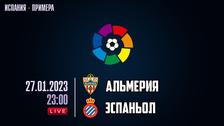 27 января 2023 года, состоялась онлайн трансляция футбольного матча между футбольным клубом Альмерия и футбольным клубом Эспаньол, проходящего в рамках чемпионата Испании.