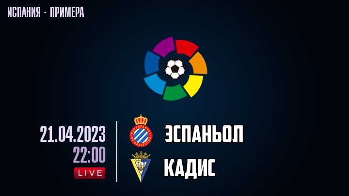 21 апреля 2023 года, состоялась онлайн трансляция футбольного матча между футбольным клубом Эспаньол и футбольным клубом Кадис, проходящего в рамках чемпионата Испании.