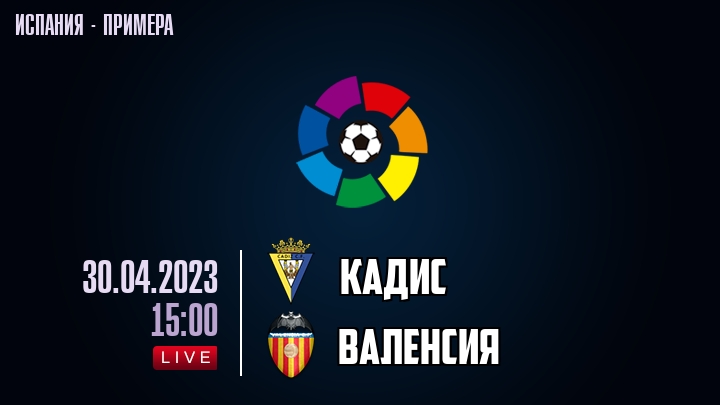 30 апреля 2023 года, состоялась онлайн трансляция футбольного матча между футбольным клубом Кадис и футбольным клубом Валенсия, проходящего в рамках чемпионата Испании.