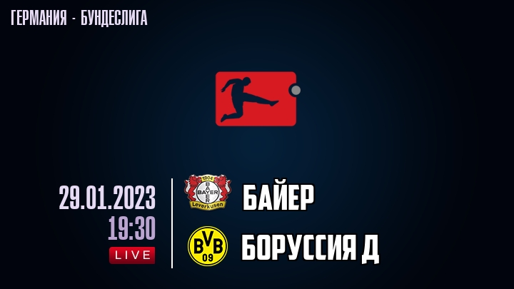 29 января 2023 года, состоялась онлайн трансляция футбольного матча между футбольным клубом Байер и футбольным клубом Боруссия Д, проходящего в рамках Бундеслиги Германии.