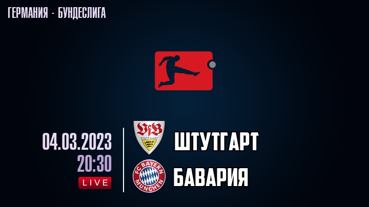 4 марта 2023 года, состоялась онлайн трансляция футбольного матча между футбольным клубом Штутгарт и футбольным клубом Бавария, проходящего в рамках Бундеслиги Германии.