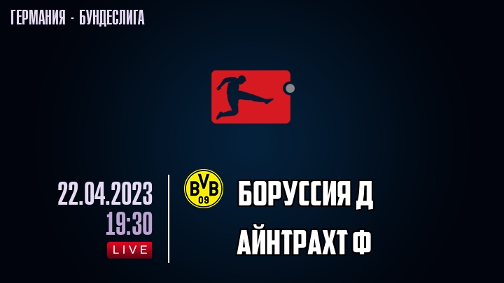 22 апреля 2023 года, состоялась онлайн трансляция футбольного матча между футбольным клубом Боруссия Д и футбольным клубом Айнтрахт Ф, проходящего в рамках Бундеслиги Германии.