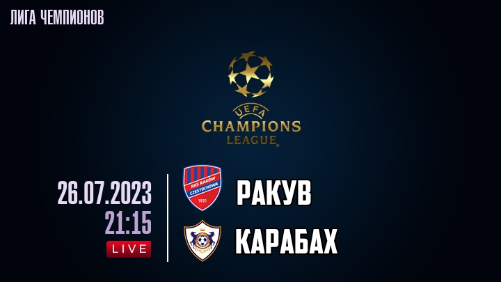 26 июля 2023 года, состоялась онлайн трансляция футбольного матча между футбольным клубом Ракув и футбольным клубом Карабах, проходящего в рамках Лиги Чемпионов.