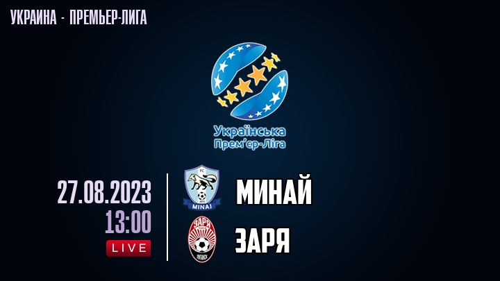 27 августа 2023 года, состоялась онлайн трансляция футбольного матча между футбольным клубом Минай и футбольным клубом Заря, проходящего в рамках Премьер лиги Украины.