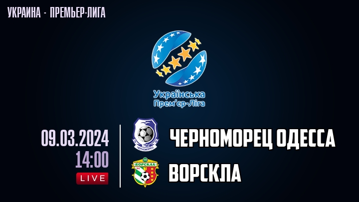 9 марта 2024 года, состоялась онлайн трансляция футбольного матча между футбольным клубом Черноморец Одесса и футбольным клубом Ворскла, проходящего в рамках Премьер лиги Украины.