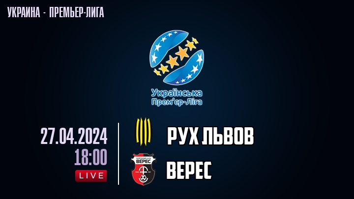 27 апреля 2024 года, состоялась онлайн трансляция футбольного матча между футбольным клубом Рух Львов и футбольным клубом Верес, проходящего в рамках Премьер лиги Украины.