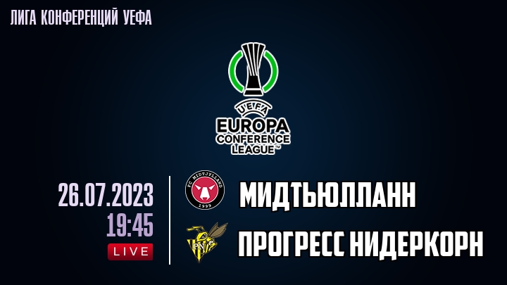 26 июля 2023 года, состоялась онлайн трансляция футбольного матча между футбольным клубом Мидтьюлланн и футбольным клубом Прогресс Нидеркорн, проходящего в рамках Лиги конференций УЕФА.