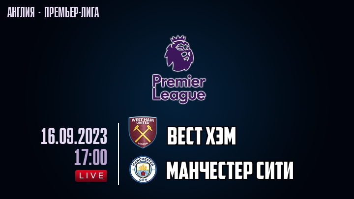 16 сентября 2023 года, состоялась онлайн трансляция футбольного матча между футбольным клубом Вест Хэм и футбольным клубом Манчестер Сити, проходящего в рамках Премьер лиги Англии.