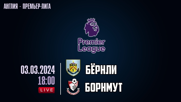 3 марта 2024 года, состоялась онлайн трансляция футбольного матча между футбольным клубом Брнли и футбольным клубом Борнмут, проходящего в рамках Премьер лиги Англии.