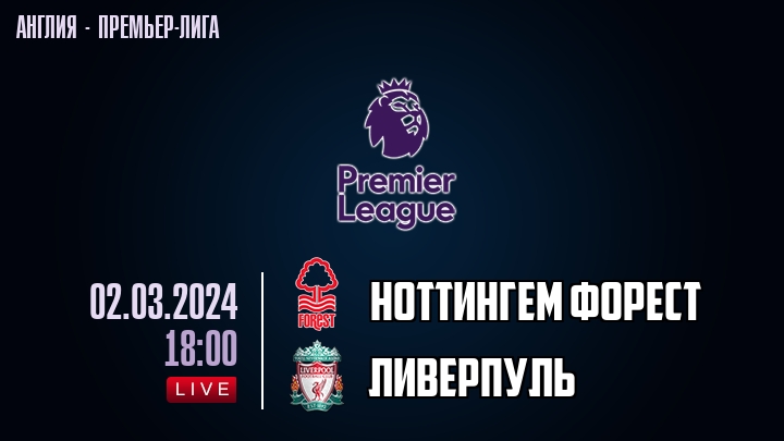 2 марта 2024 года, состоялась онлайн трансляция футбольного матча между футбольным клубом Ноттингем Форест и футбольным клубом Ливерпуль, проходящего в рамках Премьер лиги Англии.