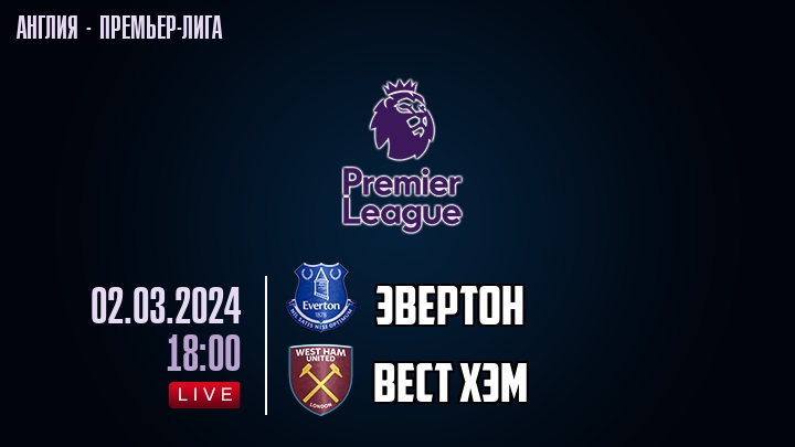 2 марта 2024 года, состоялась онлайн трансляция футбольного матча между футбольным клубом Эвертон и футбольным клубом Вест Хэм, проходящего в рамках Премьер лиги Англии.