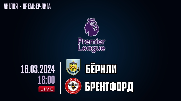 16 марта 2024 года, состоялась онлайн трансляция футбольного матча между футбольным клубом Брнли и футбольным клубом Брентфорд, проходящего в рамках Премьер лиги Англии.