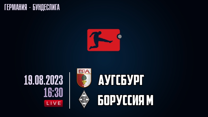 19 августа 2023 года, состоялась онлайн трансляция футбольного матча между футбольным клубом Аугсбург и футбольным клубом Боруссия М, проходящего в рамках Бундеслиги Германии.