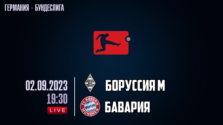 2 сентября 2023 года, состоялась онлайн трансляция футбольного матча между футбольным клубом Боруссия М и футбольным клубом Бавария, проходящего в рамках Бундеслиги Германии.