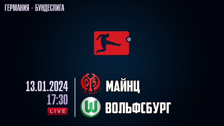 13 января 2024 года, мы предлагаем посмотреть онлайн трансляцию футбольного матча между футбольным клубом Майнц и футбольным клубом Вольфсбург, проходящего в рамках Бундеслиги Германии.