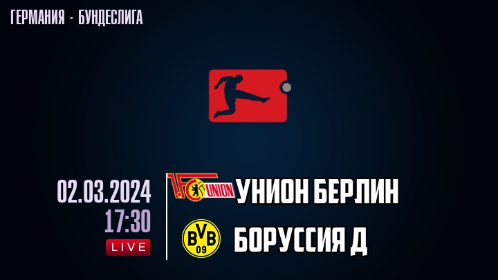 2 марта 2024 года, состоялась онлайн трансляция футбольного матча между футбольным клубом Унион Берлин и футбольным клубом Боруссия Д, проходящего в рамках Бундеслиги Германии.
