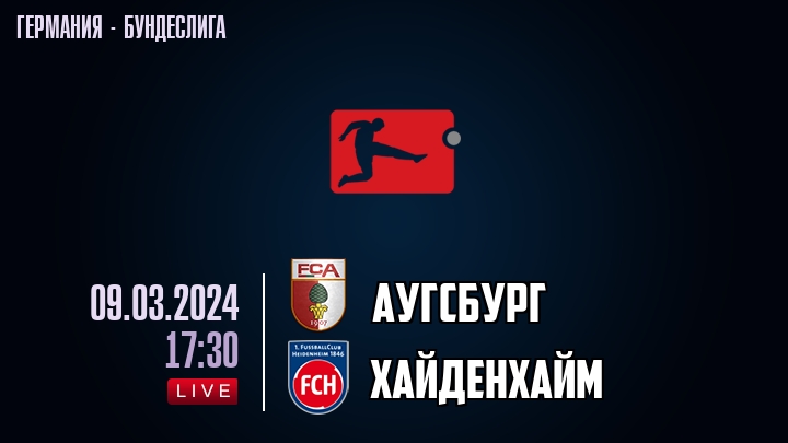 9 марта 2024 года, состоялась онлайн трансляция футбольного матча между футбольным клубом Аугсбург и футбольным клубом Хайденхайм, проходящего в рамках Бундеслиги Германии.