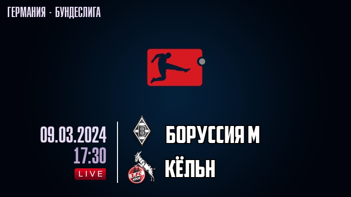 9 марта 2024 года, состоялась онлайн трансляция футбольного матча между футбольным клубом Боруссия М и футбольным клубом Кльн, проходящего в рамках Бундеслиги Германии.