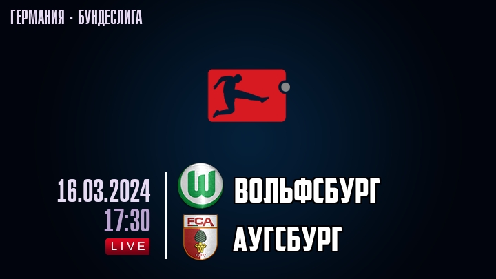 16 марта 2024 года, состоялась онлайн трансляция футбольного матча между футбольным клубом Вольфсбург и футбольным клубом Аугсбург, проходящего в рамках Бундеслиги Германии.