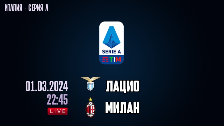 1 марта 2024 года, состоялась онлайн трансляция футбольного матча между футбольным клубом Лацио и футбольным клубом Милан, проходящего в рамках Серии А чемпионата Италии.