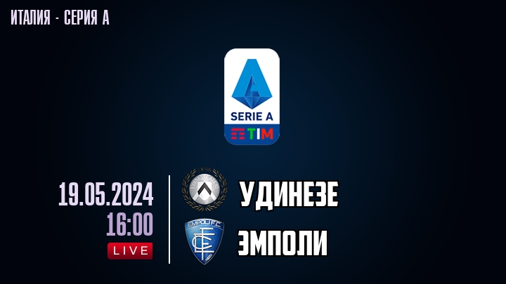 19 мая 2024 года, состоялась онлайн трансляция футбольного матча между футбольным клубом Удинезе и футбольным клубом Эмполи, проходящего в рамках Серии А чемпионата Италии.
