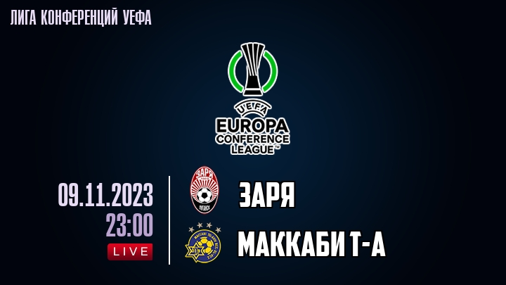 9 ноября 2023 года, состоялась онлайн трансляция футбольного матча между футбольным клубом Заря и футбольным клубом Маккаби Т-А, проходящего в рамках Лиги конференций УЕФА.