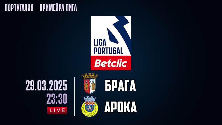 29 марта 2025 года, состоялась онлайн трансляция футбольного матча между футбольным клубом Брага и футбольным клубом Арока, проходящего в рамках Примейра-лиги Португалии.