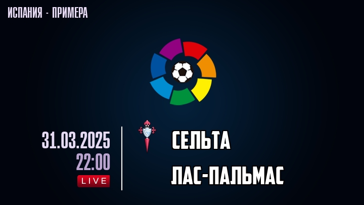 31 марта 2025 года, состоялась онлайн трансляция футбольного матча между футбольным клубом Сельта и футбольным клубом Лас-Пальмас, проходящего в рамках чемпионата Испании.