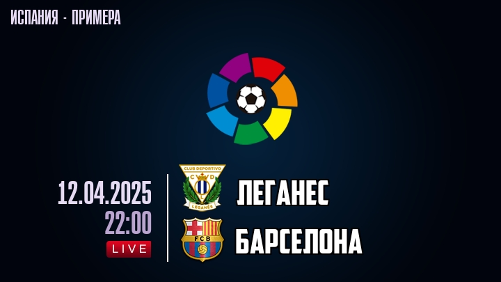 12 апреля 2025 года, состоялась онлайн трансляция футбольного матча между футбольным клубом Леганес и футбольным клубом Барселона, проходящего в рамках чемпионата Испании.