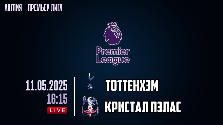 11 мая 2025 года, состоялась онлайн трансляция футбольного матча между футбольным клубом Тоттенхэм и футбольным клубом Кристал Пэлас, проходящего в рамках Премьер лиги Англии.