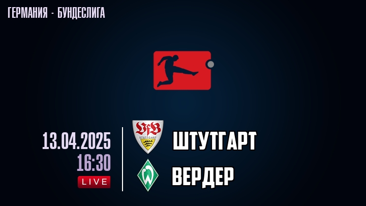 13 апреля 2025 года, состоялась онлайн трансляция футбольного матча между футбольным клубом Штутгарт и футбольным клубом Вердер, проходящего в рамках Бундеслиги Германии.