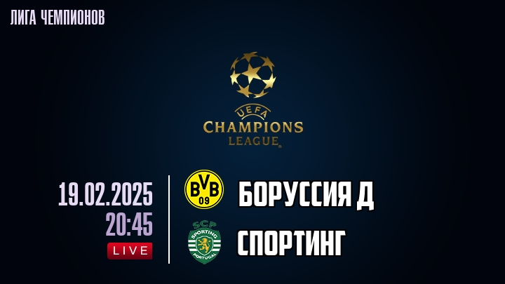 19 февраля 2025 года, состоялась онлайн трансляция футбольного матча между футбольным клубом Боруссия Д и футбольным клубом Спортинг, проходящего в рамках Лиги Чемпионов.