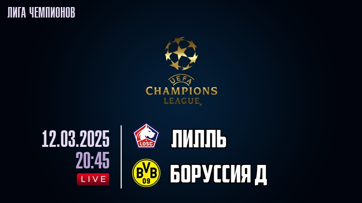 12 марта 2025 года, состоялась онлайн трансляция футбольного матча между футбольным клубом Лилль и футбольным клубом Боруссия Д, проходящего в рамках Лиги Чемпионов.