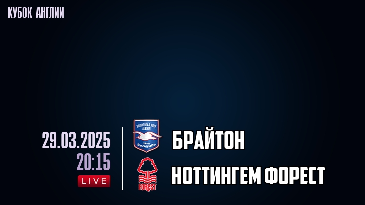 29 марта 2025 года, состоялась онлайн трансляция футбольного матча между футбольным клубом Брайтон и футбольным клубом Ноттингем Форест, проходящего в рамках Кубка Англии.