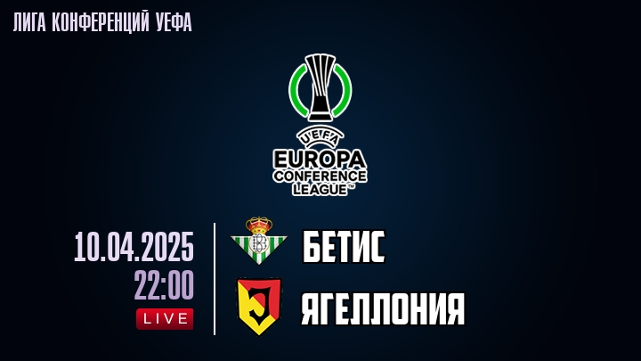 10 апреля 2025 года, мы предлагаем посмотреть онлайн трансляцию футбольного матча между футбольным клубом Бетис и футбольным клубом Ягеллония, проходящего в рамках Лиги конференций УЕФА.