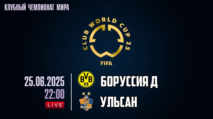 25 июня 2025 года, состоялась онлайн трансляция футбольного матча между футбольным клубом Боруссия Д и футбольным клубом Ульсан, проходящего в рамках Клубного чемпионата мира.
