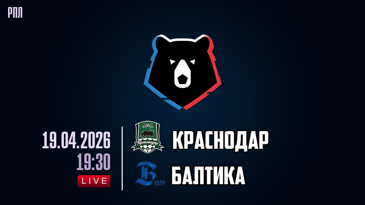 19 апреля 2026 года, мы предлагаем посмотреть онлайн трансляцию футбольного матча между футбольным клубом Краснодар и футбольным клубом Балтика, проходящего в рамках чемпионата РПЛ.